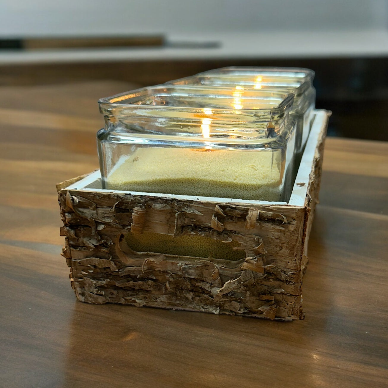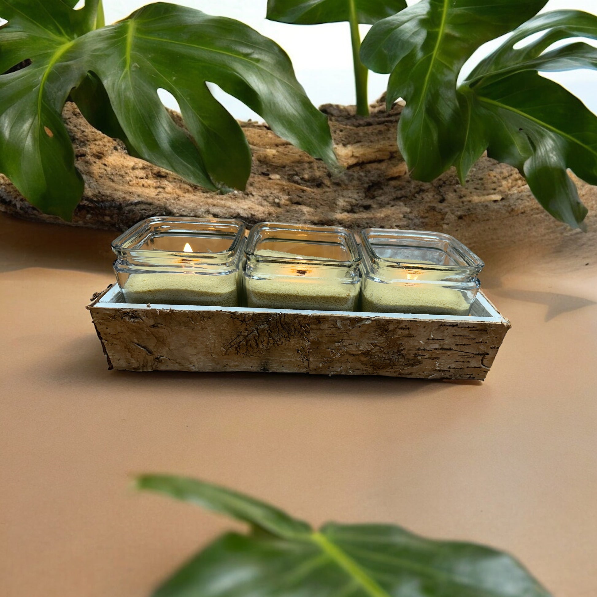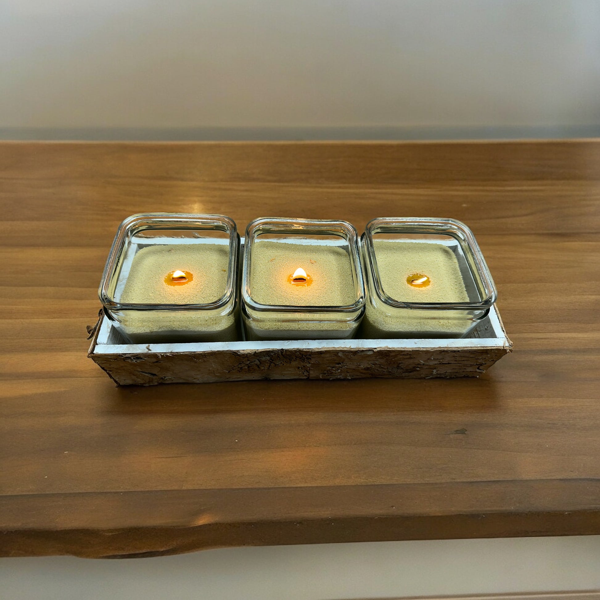 Introducing the Attesh Trio Sand Candle base, a stunning centerpiece featuring three sleek glass containers. Each glass jar measures 4.5” x 4.5” and is set within a rustic, nature-inspired birch wood tray measuring 16” x 6” x 3”.