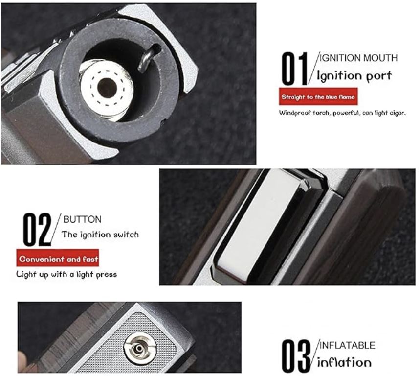 Our torch lighter features a heat-resistant ceramic nozzle and a burn-free finger guard, keeping your hands safe from the flame. Equipped with a security lock to prevent accidental ignition, ensuring safety at all times.
