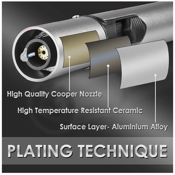 Unlike cheaper alternatives, our torch lighter is constructed with a premium full metal (aluminum alloy) body and advanced surface plating for added durability. Featuring three layers of safety protection and a heat-resistant ceramic nozzle, it's built to last.