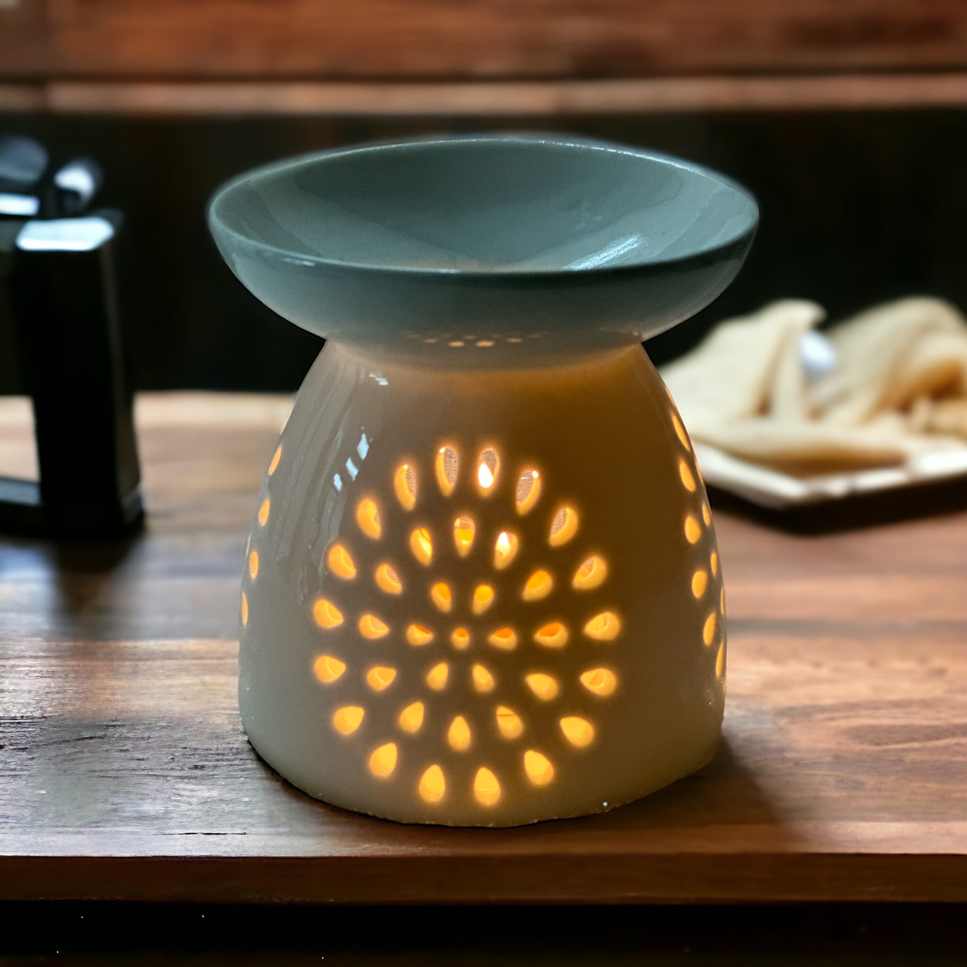 - The tealight oil burner is made of glazed ceramic with a hollow-carved design, giving your indoor space an artful appeal.