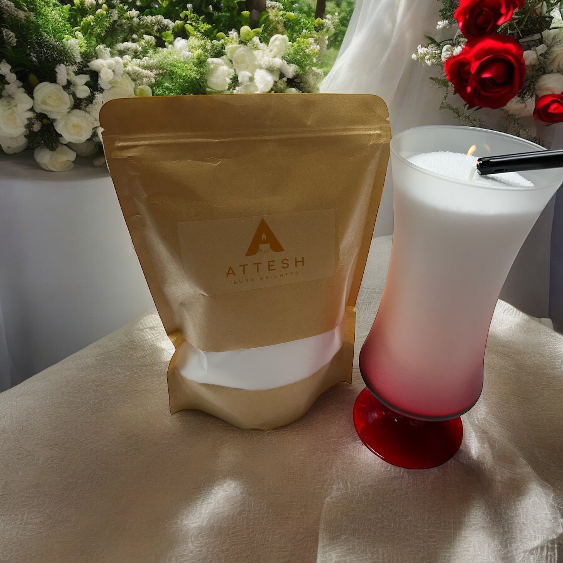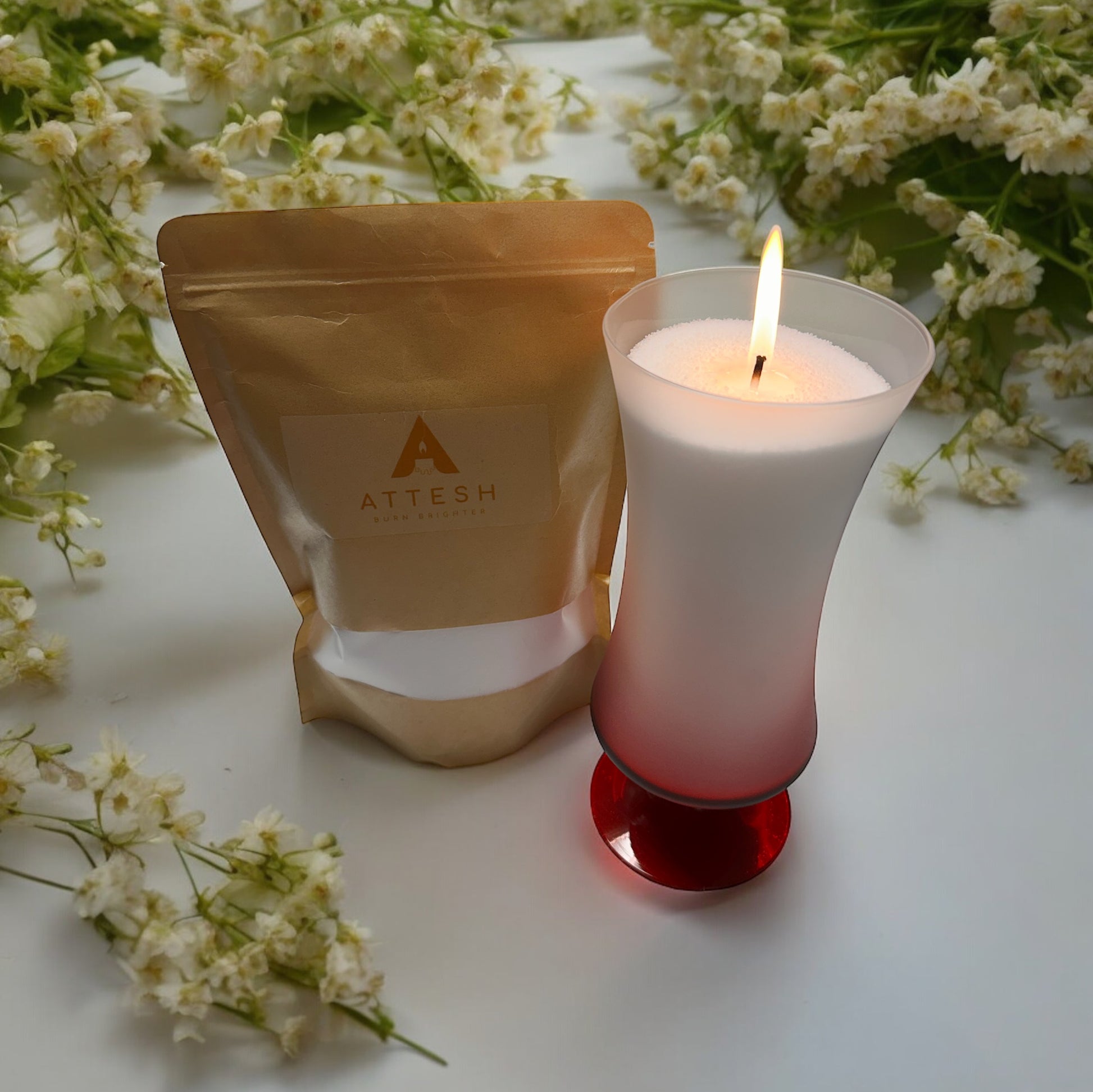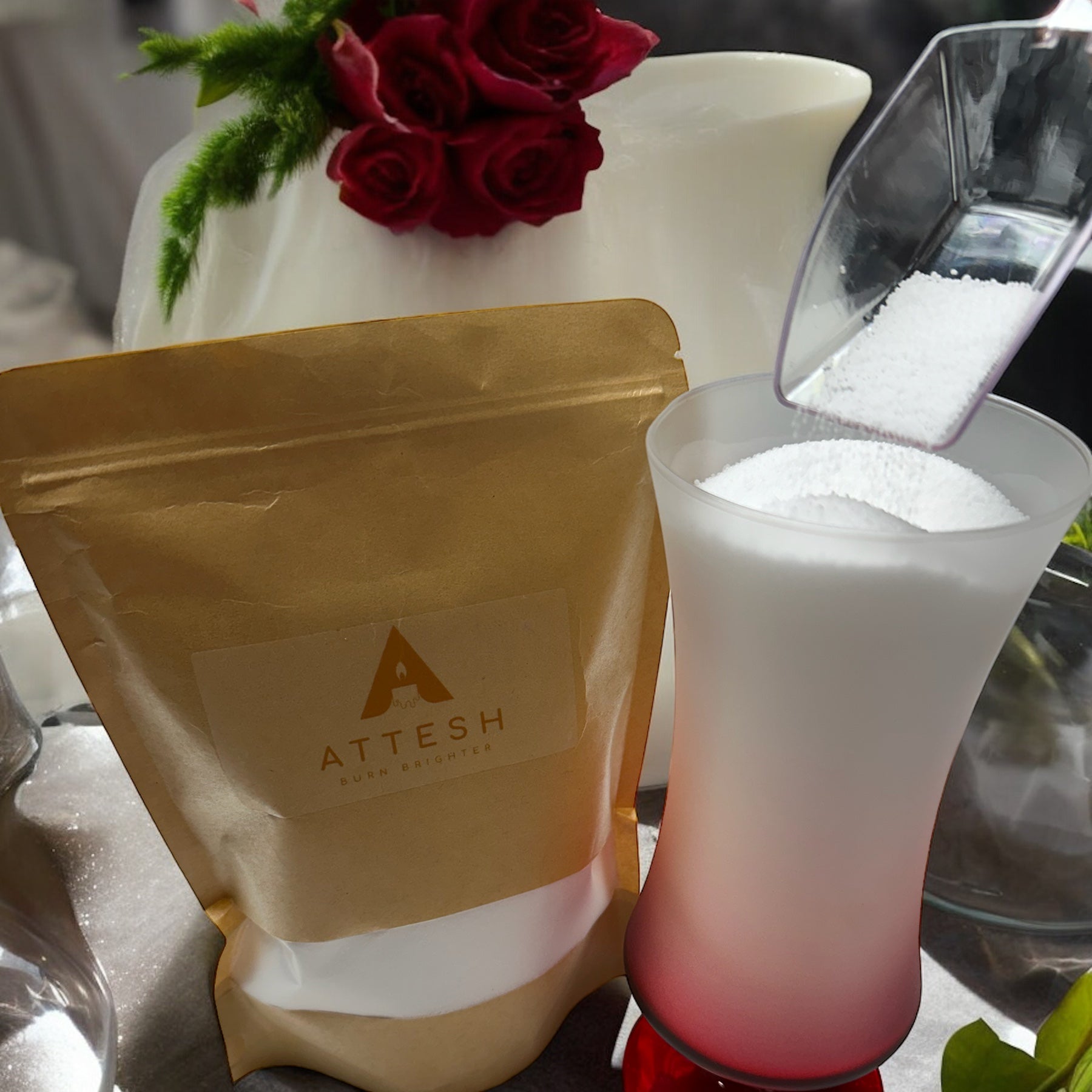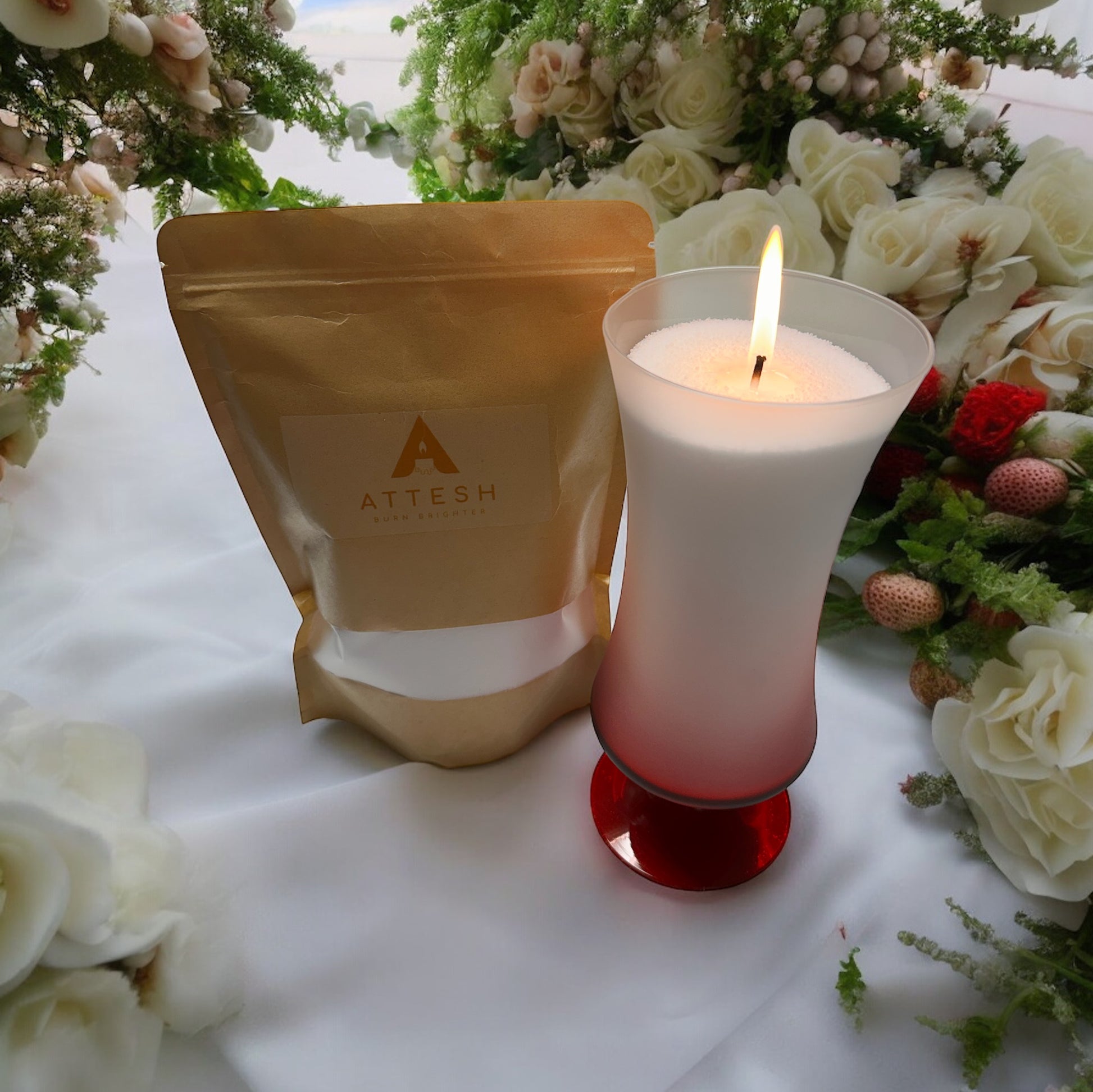 Deluxe Package, thoughtfully curated to enchant and inspire. Elevate your senses and surround yourself with beauty and tranquility by adding two bottles of 100% Organic Uncut Essential Oils to our already exquisite Attesh Sand Candle and 9 3/4" Footed Frosted Ruby Vase.